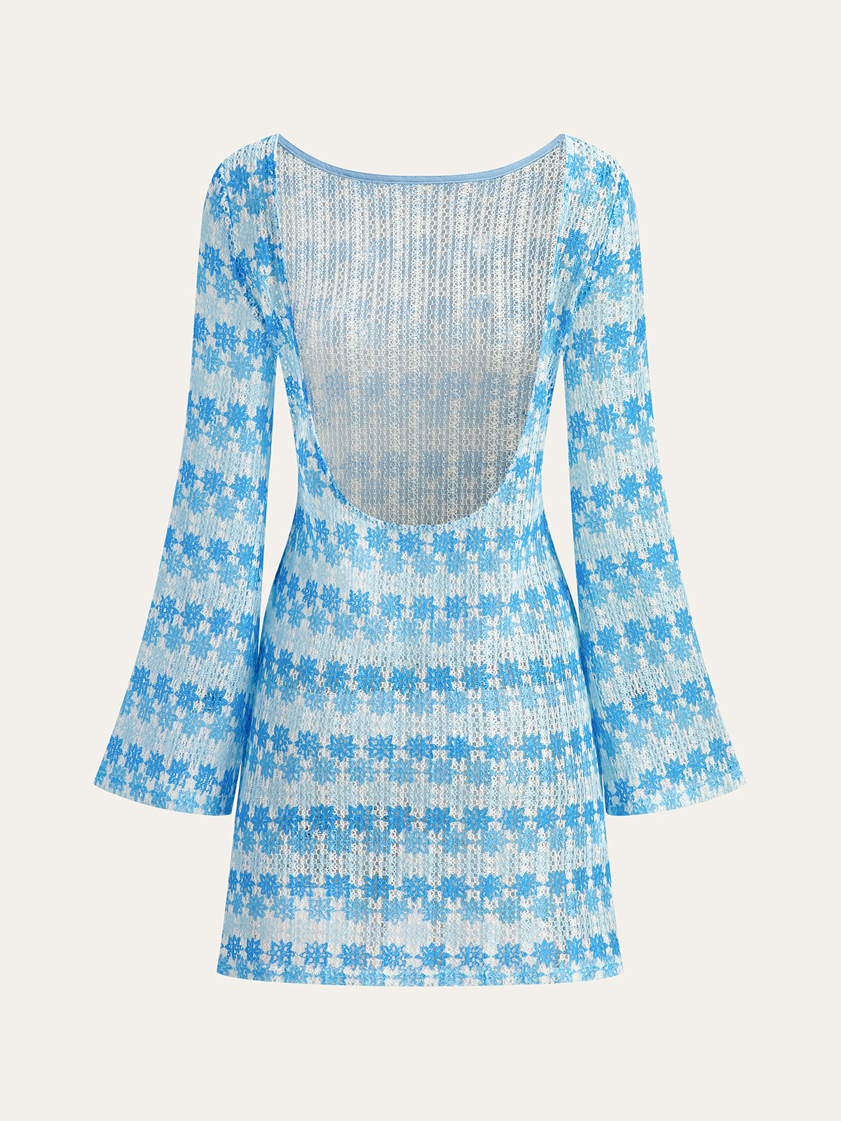 Semi-Sheer Backless Crochet Dress with Flared Sleeves$44.43 USD -