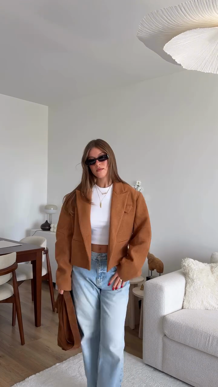 This brown cropped jacket features a blazer-style design, a notched collar, and a relaxed fit. Made from soft wool for warmth and style, it's perfect for casual or semi-casual outings—pair it with a white crop top, jeans, sunglasses, and a necklace.