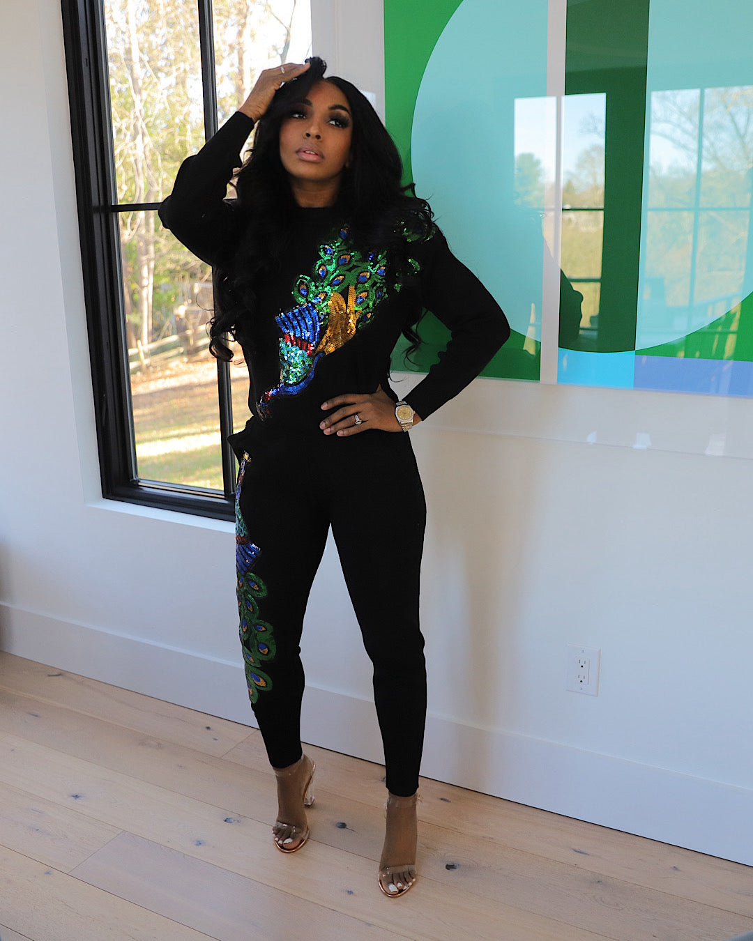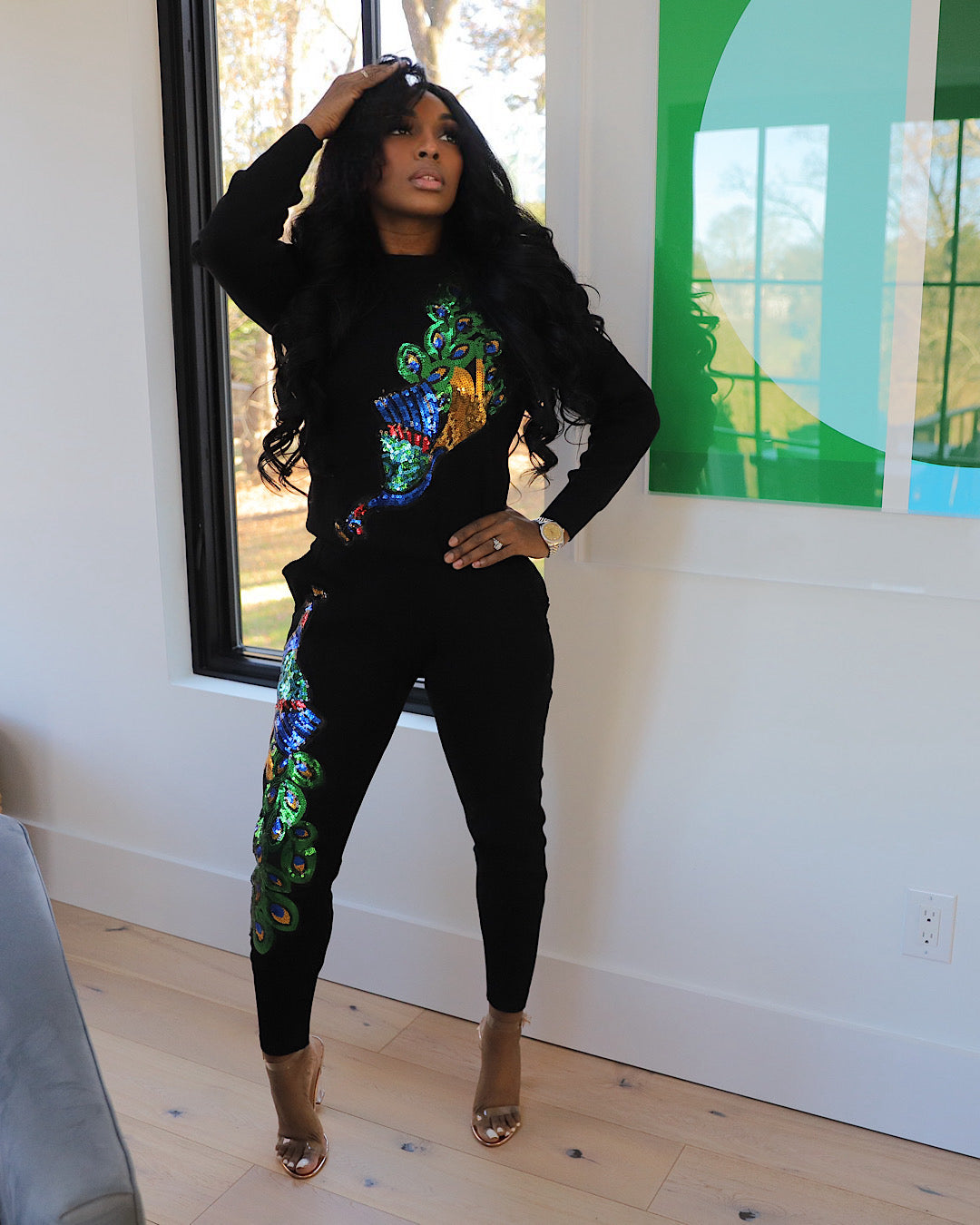 Sequin heavy knit set features peacock design detailing. Set is true to size. Model wearing a size Small